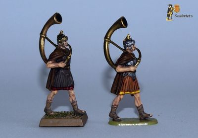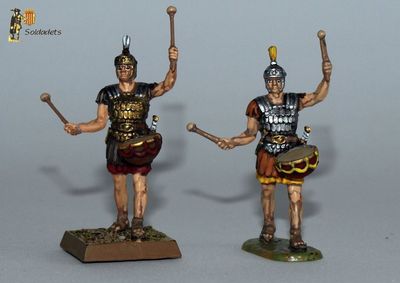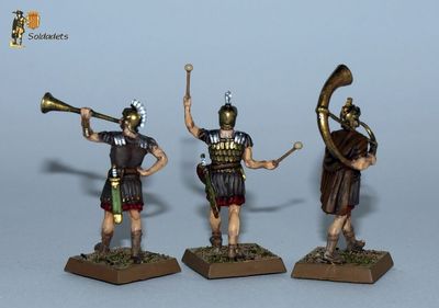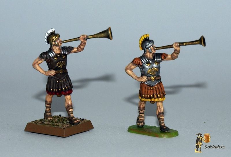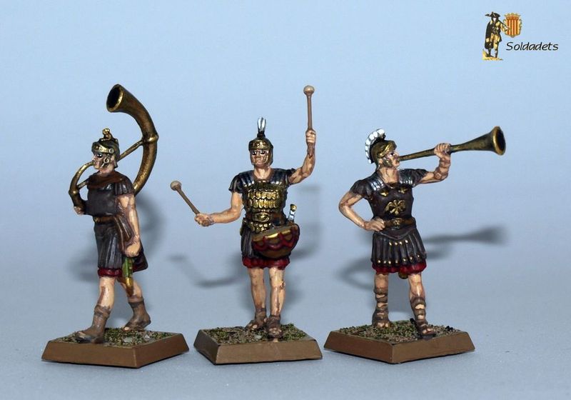 L'esquema de pintura aplicat és l'habitual de túniques roges, cascs de bronze, cuirasses de cuir o bronze i resta d'elements en bronze o ferro. L'única diferència amb els legionaris combatents és que les crineres dels meus músics són blanques en lloc de negres. Les bases originals (allà on n'hi havia) han estat substituïdes per bases quadrades de plàstic de 20x20mm, imantades per sota.