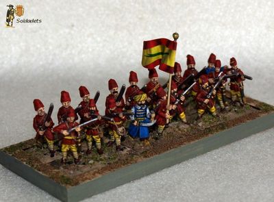 Avui us voldria presentar el meu segon regiment d'infanteria provincial otomana, composat com el primer per figures de la marca polonesa Wargamer.pl (primera línia), i de la firma italiana Legio Heroica (segona línia i grup de comandament); amb l'afegit en aquesta ocasió d'un parell de figures de la britànica Essex, que a primera vista semblaven força compatibles amb les precedents.