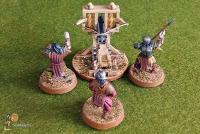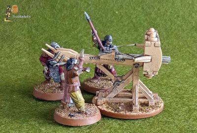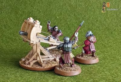 Temps enrere, la marca russa Zvezda va llançar al marcat el conjunt 8014 amb títol "Siege Machines Kit I", que contenia les maquetes en plàstic d'una catapulta, una balista i tres parapets, tots a escala 1/72. Després d'anys de tindre-les desades en un calaix sense fer-ne res, recentment se'm va acudir de fer-ne servir alguna per a la meva col·lecció de figures de la Terra Mitjana... i aquí la teniu, muntada, pintada i operada per tres orcs de Games Workshop.