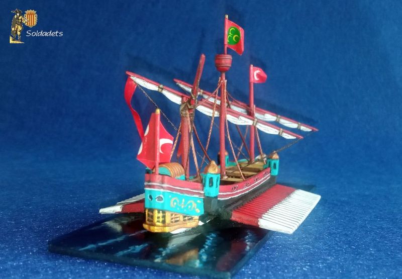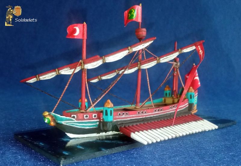 Vaig refer la secció de proa emprant una peça d'un kit de plàstic i una mica de masilla; els resultats no foren perfectes, però sí suficients al meu entendre; amb l'avantatge addicional de diferenciar la meva galiassa del model venecià original, doncs pensava utilitzar el model com a vaixell otomà. Per acabar de reblar-ne la personalització, vaig afegir-hi quatre garites extretes d'un galió de Skytrex, que pel seu sostre com de cúpula havien d'accentuar-ne l'aire oriental.