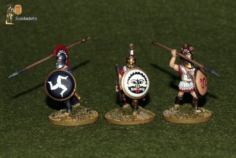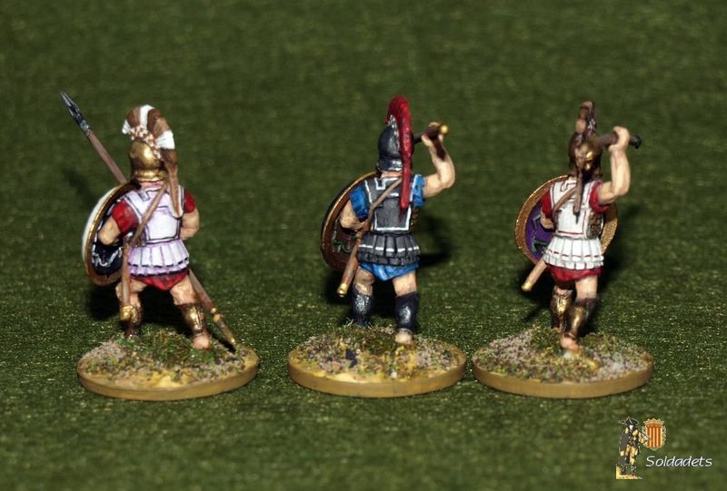 Aquest és un altre exemple de figures adquirides fa molt de temps, i que van quedar oblidades en una capsa de sabates fins al meu recentment despertat interès per la Mitologia clàssica. Es tracta de tres hoplites grecs clàssics de la firma italiana Mirliton SG que havien quedat a mig pintar, que aquests darrers dies he estat retocant i finalitzant.