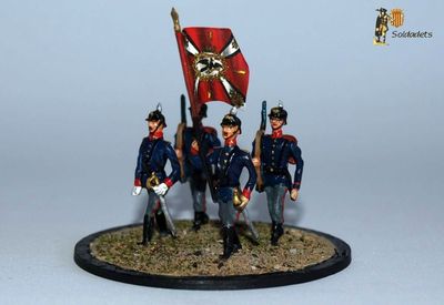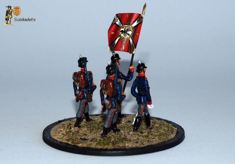 Les quatre figures d'avui formen també part de la meva col·lecció d'infantesa, fabricades cap a finals dels 60 o principis dels 70 del segle XX per la marca valenciana Alymer, com una categoria especial de miniatures de 33mm anomenada "Miniploms". El conjunt representa uns soldats prussians d'infanteria d'algun moment entre 1842 i 1907, quan els uniformes blaus van ser reemplaçats pels de color gris verdós que serien emprats durant la Primera Guerra Mundial.