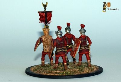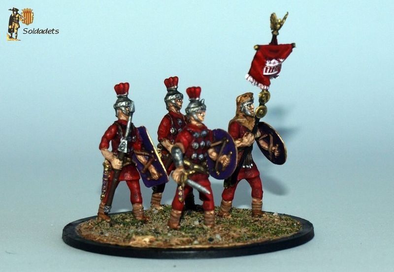 Aquest és un dels conjunts de l'antiga casa Alymer que més m'ha fascinat sempre, per la seva inusual i heterodoxa aparença. Es tracta d'uns legionaris romans que cal presumir com a imperials tardans, i molt possiblement pertanyents a una guarnició del Rhin o del mur d'Adrià, com semblaria indicar la seva abrigada vestimenta. Cal destacar-ne l'estranya armadura corporal, que no és lorica segmentata ni lorica hamata, sinó un jupa de cuir reforçada frontalment amb unes phalera o condecoracions discoidals. Això darrer faria pensar que els d'Alymer hi volien representar alguna unitat d'elit o veterana.